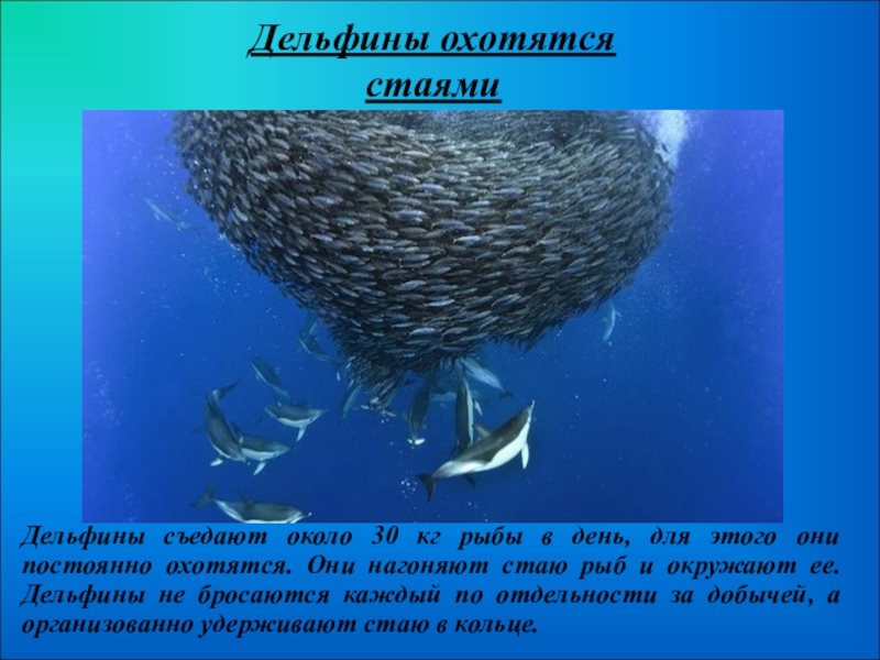 этого они постоянно охотятся. Они нагоняют стаю рыб и окружают ее. Дельфины не бросаются каждый по отдельности за добычей, а организованно удерживают стаю в кольце.
