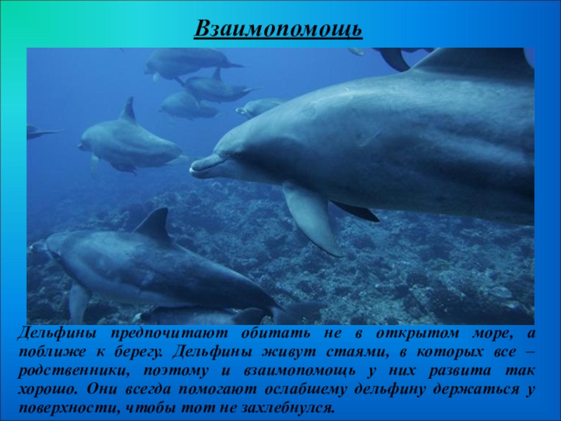 Дельфины живут стаями, в которых все – родственники, поэтому и взаимопомощь у них развита так хорошо. Они всегда помогают ослабшему дельфину держаться у поверхности, чтобы тот не захлебнулся.