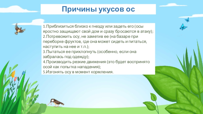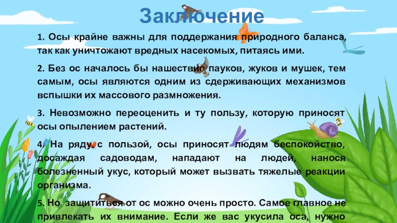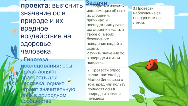 1. Собрать и изучить информацию об осах: их строении, причинах и последствиях укусов ос; строении жала, а также о мерах безопасного поведения людей с осами.