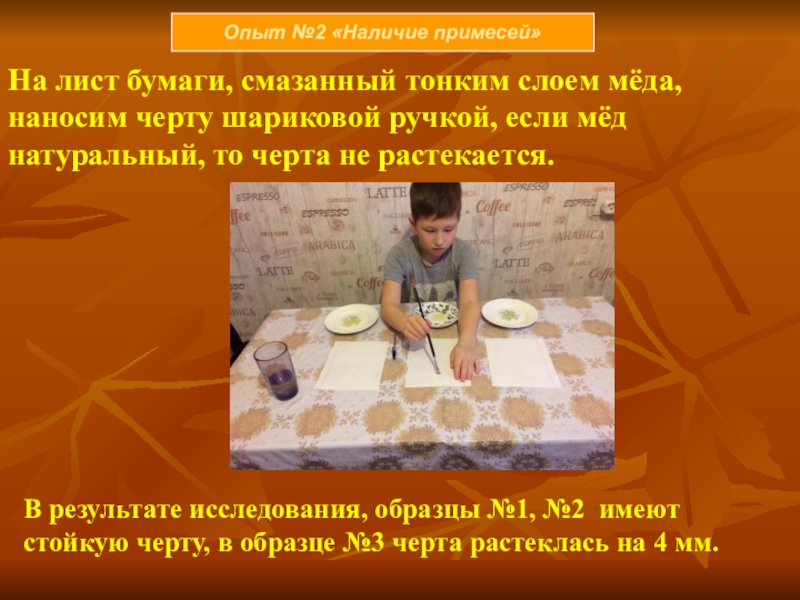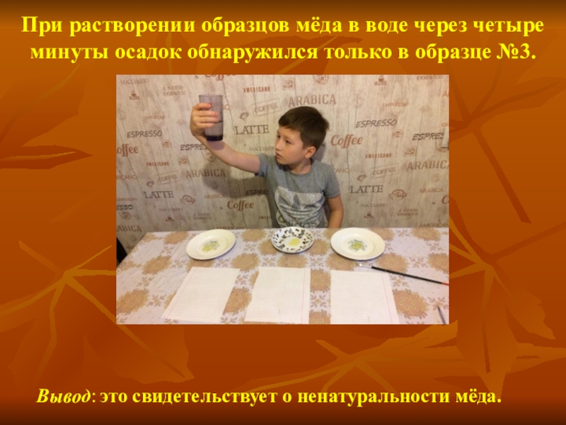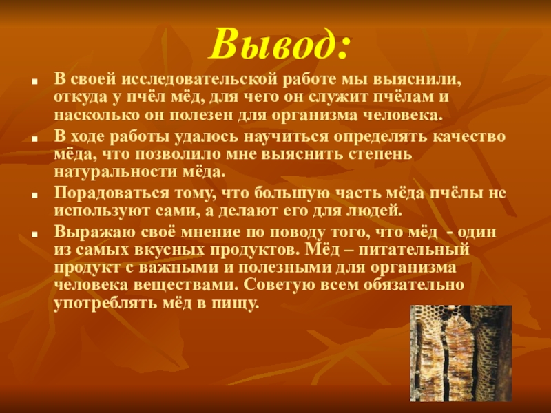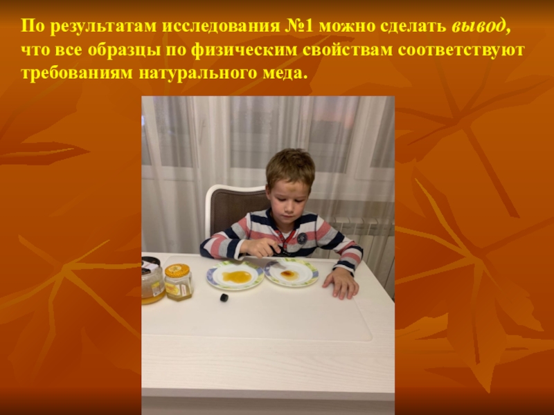 По результатам всех исследований мы вправе сделать вывод: образцы №1, №2 представляют собой натуральный мёд, а образец №3 не соответствует всем требованиям натуральности мёда.