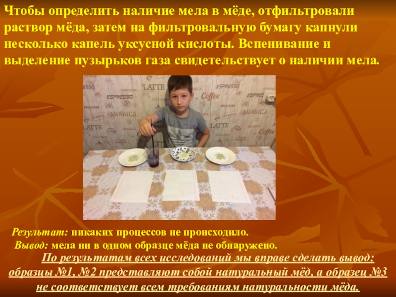 Вывод: мела ни в одном образце мёда не обнаружено.
