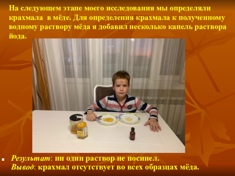 Вывод: крахмал отсутствует во всех образцах мёда.