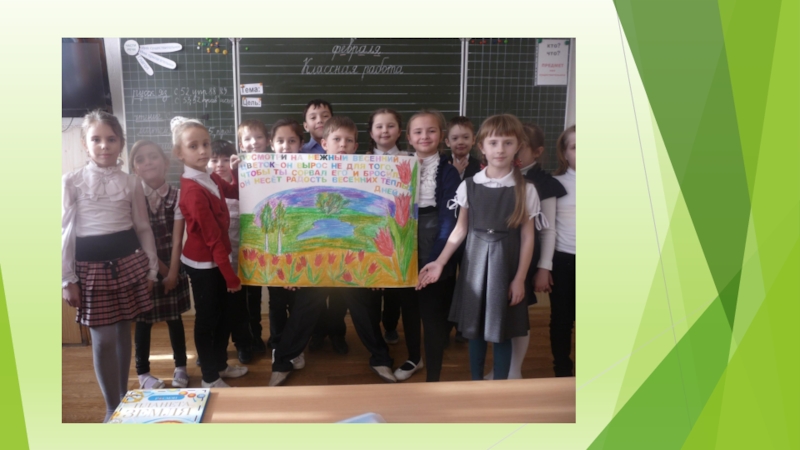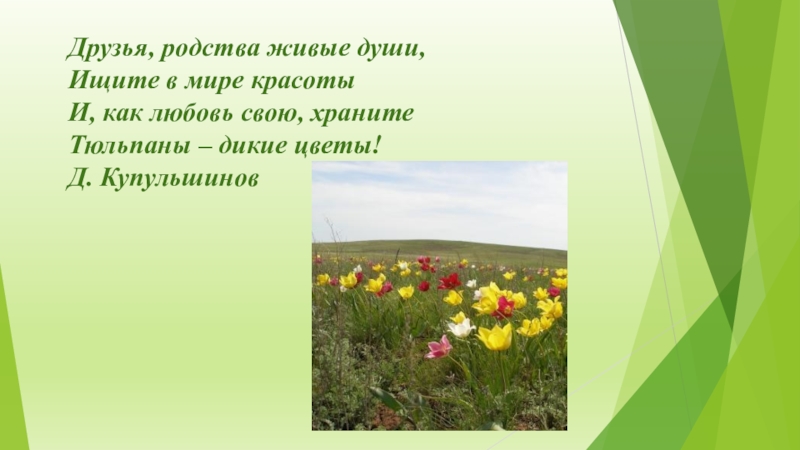 Друзья, родства живые души, Ищите в мире красоты И, как любовь свою, храните Тюльпаны – дикие цветы!
