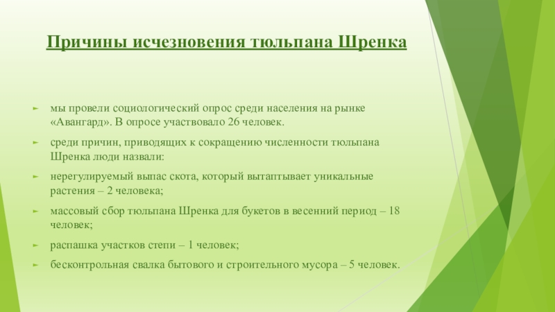 Причины исчезновения тюльпана Шренкамы провели социологический опрос среди населения на рынке «Авангард». В опросе участвовало 26 человек.среди