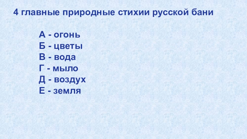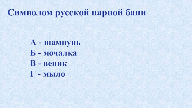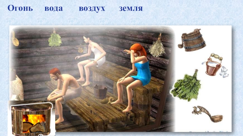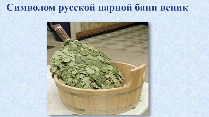 почти священным местом. Считалось, что баня объединяет 4 главные природные стихии: огонь, вода, воздух и земля. Поэтому человек, посетивший баню, как бы вбирал в себя силу всех этих стихий и становился крепче, сильнее и здоровее. Недаром на Руси бытовала поговорка «Помылся – будто заново родился!». Веник является символом русской парной бани, её украшением и инструментом лечения или профилактики болезней.