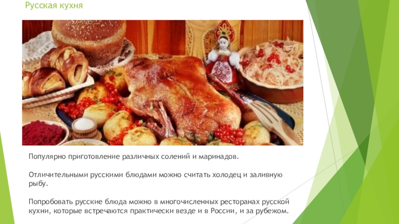 Попробовать русские блюда можно в многочисленных ресторанах русской кухни, которые встречаются практически везде и в России, и за рубежом.