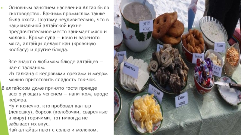 Поэтому неудивительно, что в национальной алтайской кухне предпочтительное место занимает мясо и молоко. Кроме супа — кoчo и вареного мяса, алтайцы делают кан (кровяную колбасу) и другие блюда.