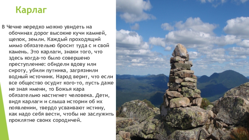 щепок, земли. Каждый проходящий мимо обязательно бросит туда с и свой камень. Это карлаги, знаки того, что здесь когда-то было совершено преступление: обидели вдову или сироту, убили путника, загрязнили водный источник. Народ верит, что если все общество осудит кого-то, пусть даже не зная имени, то Божья кара обязательно настигнет человека. Дети, видя карлаги и слыша истории об их появлении, твердо усваивают истину, как надо себя вести, чтобы не заслужить проклятие своих сородичей.