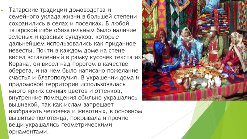 в селах и поселках. В любой татарской избе обязательным было наличие зеленых и красных сундуков, которые дальнейшем использовались как приданное невесты. Почти в каждом доме на стене висел вставленный в рамку кусочек текста из Корана, он висел над порогом в качестве оберега, и на нем было написано пожелание счастья и благополучия. В украшении дома и придомовой территории использовалась много ярких сочных цветов и оттенков, внутренние помещения обильно украшались вышивкой, так как ислам запрещает изображать человека и животных, в основном вышитые полотенца, покрывала и прочие вещи украшались геометрическими орнаментами.