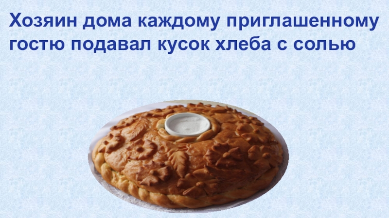Встречали гостей хлебом, солью. Со словами: «Добро пожаловать!» Гость отламывает маленький кусочек хлеба, макает его в соль и кушает