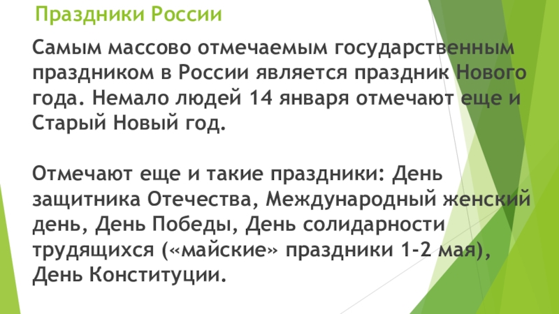 Отмечают еще и такие праздники: День защитника Отечества, Международный женский день, День Победы, День солидарности трудящихся («майские» праздники 1-2 мая), День Конституции.