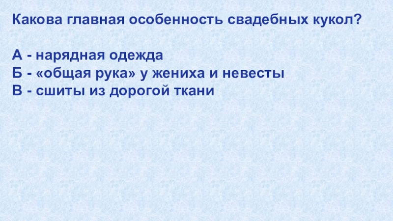 Встреча молодых - караваем и солью, главная особенность свадебных кукол - «общая рука» у жениха и невесты.