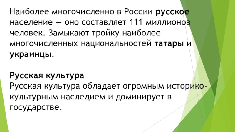 Слайд 4Наиболее многочисленно в России русское население — оно составляет 111 миллионов