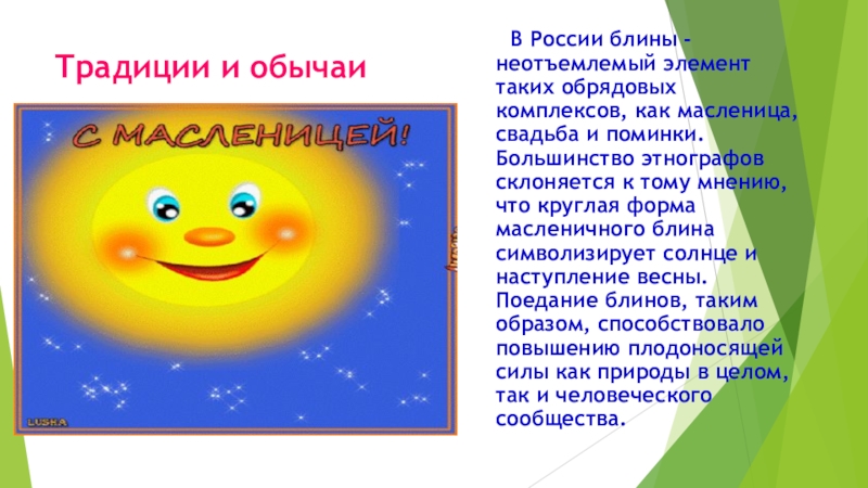 таких обрядовых комплексов, как масленица, свадьба и поминки. Большинство этнографов склоняется к тому мнению, что круглая форма масленичного блина символизирует солнце и наступление весны. Поедание блинов, таким образом, способствовало повышению плодоносящей силы как природы в целом, так и человеческого сообщества.