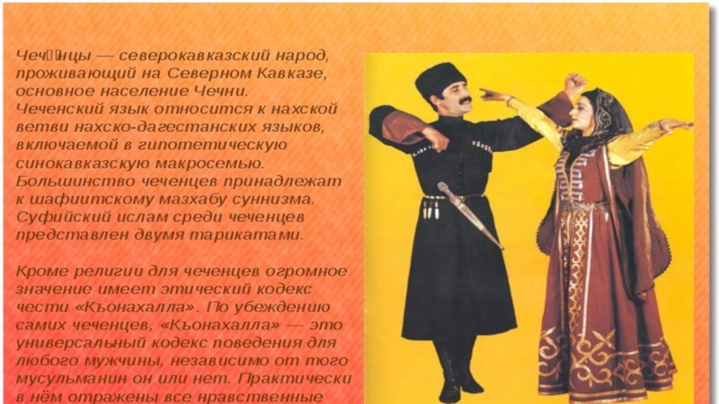 и соблюдают традиции, переданные старшим поколением. Столетиями складывался в чеченском обществе свод правил поведения. Многие из них перечислены в Моральном кодексе.