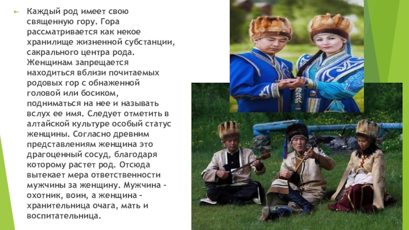 жизненной субстанции, сакрального центра рода. Женщинам запрещается находиться вблизи почитаемых родовых гор с обнаженной головой или босиком, подниматься на нее и называть вслух ее имя. Следует отметить в алтайской культуре особый статус женщины. Согласно древним представлениям женщина это драгоценный сосуд, благодаря которому растет род. Отсюда вытекает мера ответственности мужчины за женщину. Мужчина – охотник, воин, а женщина – хранительница очага, мать и воспитательница.
