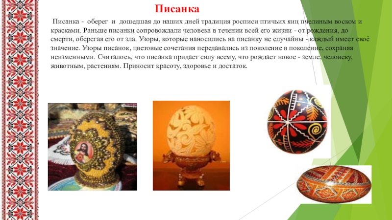 птичьих яиц пчелиным воском и красками. Раньше писанки сопровождали человека в течении всей его жизни - от рождения, до смерти, оберегая его от зла. Узоры, которые наносились на писанку не случайны - каждый имеет своё значение. Узоры писанок, цветовые сочетания передавались из поколение в поколение, сохраняя неизменными. Считалось, что писанка придает силу всему, что рождает новое - земле, человеку, животным, растениям. Приносит красоту, здоровье и достаток.