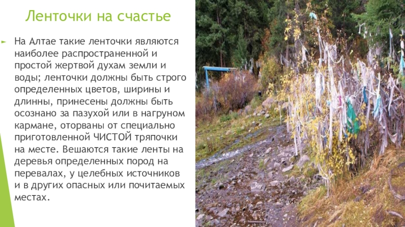 жертвой духам земли и воды; ленточки должны быть строго определенных цветов, ширины и длинны, принесены должны быть осознано за пазухой или в нагруном кармане, оторваны от специально приготовленной ЧИСТОЙ тряпочки на месте. Вешаются такие ленты на деревья определенных пород на перевалах, у целебных источников и в других опасных или почитаемых местах.