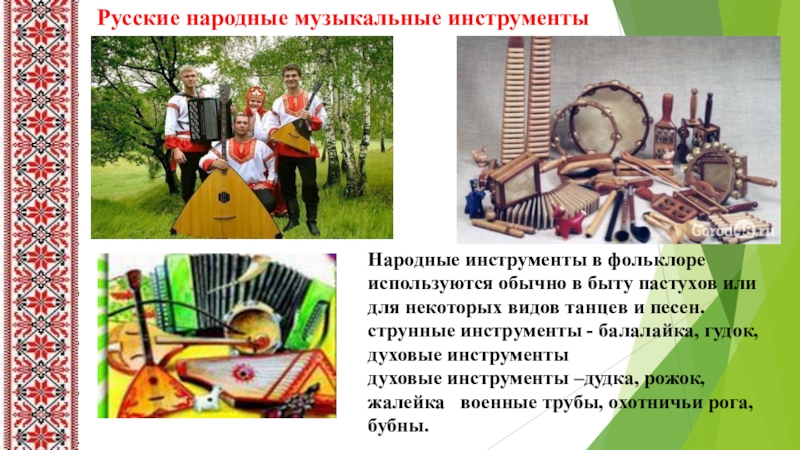 струнные инструменты - балалайка, гудок, духовые инструменты