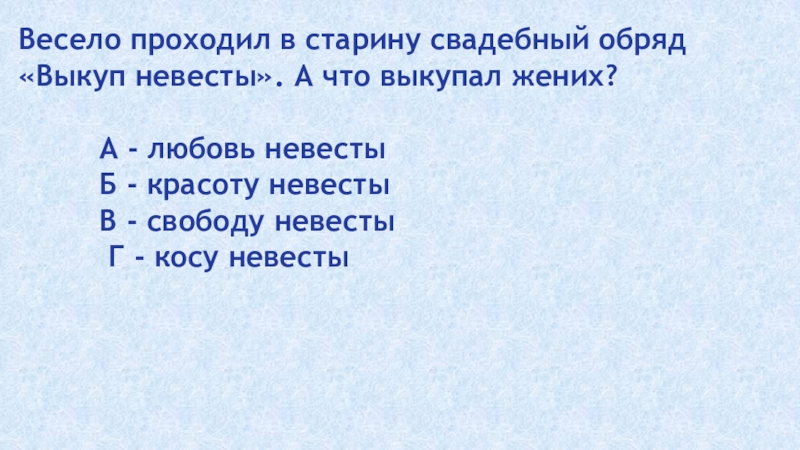 Свадебный обряд - весело проходил в старину свадебный обряд «Выкуп невесты». Жених выкупал косу невесты.