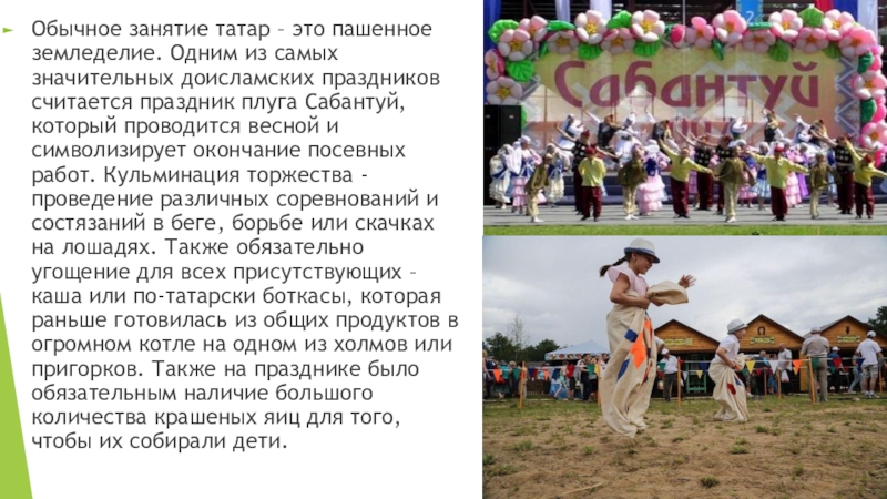 доисламских праздников считается праздник плуга Сабантуй, который проводится весной и символизирует окончание посевных работ. Кульминация торжества - проведение различных соревнований и состязаний в беге, борьбе или скачках на лошадях. Также обязательно угощение для всех присутствующих – каша или по-татарски боткасы, которая раньше готовилась из общих продуктов в огромном котле на одном из холмов или пригорков. Также на празднике было обязательным наличие большого количества крашеных яиц для того, чтобы их собирали дети.