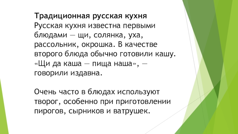 рассольник, окрошка. В качестве второго блюда обычно готовили кашу. «Щи да каша — пища наша», — говорили издавна.