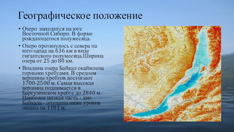 Впадина озера Байкал окаймлена горными хребтами. В среднем вершины хребтов достигают 1700-2500 м. Самая высокая вершина поднимается в Баргузинском хребте до 2840 м. Наиболее низкая часть - дно Байкала - опущена ниже уровня океана на 1181 м.