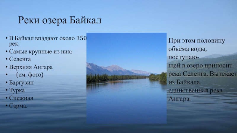щей в озеро приносит река Селенга. Вытекает из Байкала единственная река Ангара.