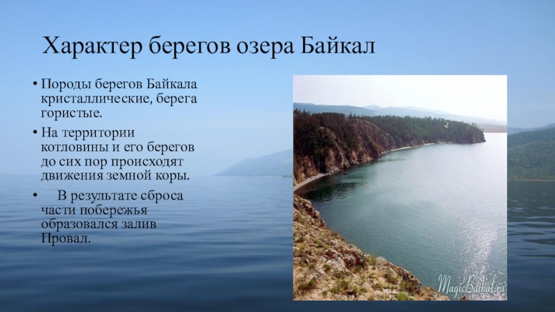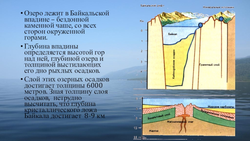 Слайд 5Озеро лежит в Байкальской впадине – бездонной каменной чаше, со всех