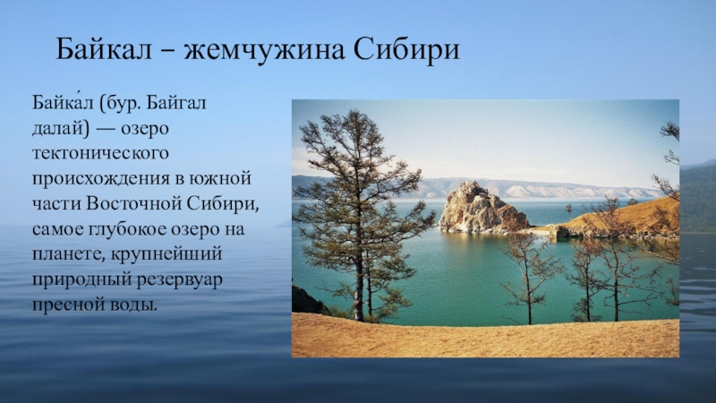 Байка́л (бур. Байгал далай) — озеро тектонического происхождения