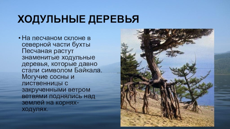 ходульные деревья, которые давно стали символом Байкала. Могучие сосны и лиственницы с закрученными ветром ветвями поднялись над землей на корнях-ходулях.