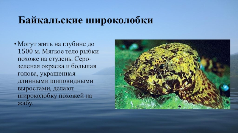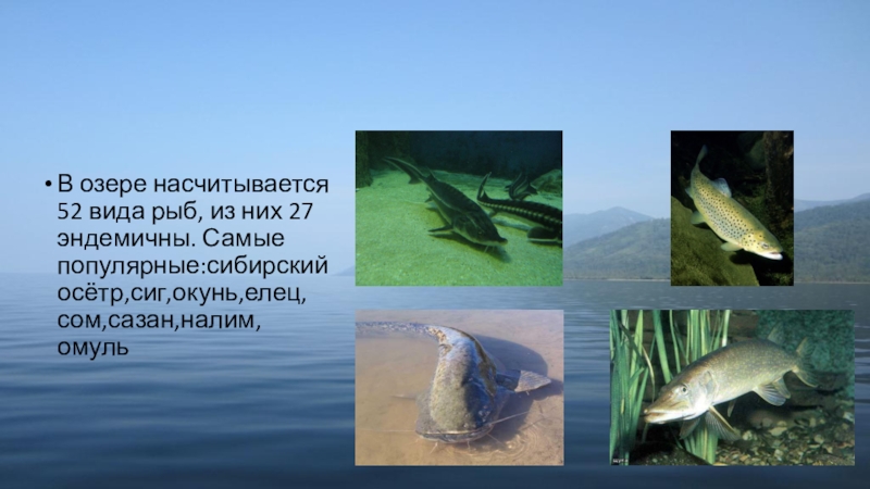 Слайд 17В озере насчитывается 52 вида рыб, из них 27 эндемичны. Самые