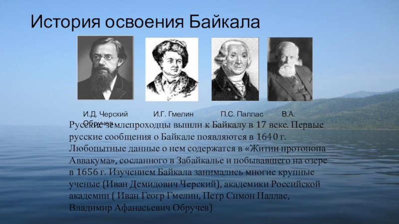 русские сообщения о Байкале появляются в 1640 г. Любопытные данные о нем содержатся в «Житии протопопа Аввакума», сосланного в Забайкалье и побывавшего на озере в 1656 г. Изучением Байкала занимались многие крупные ученые (Иван Демидович Черский), академики Российской академии ( Иван Геогр Гмелин, Петр Симон Паллас, Владимир Афанасьевич Обручев)