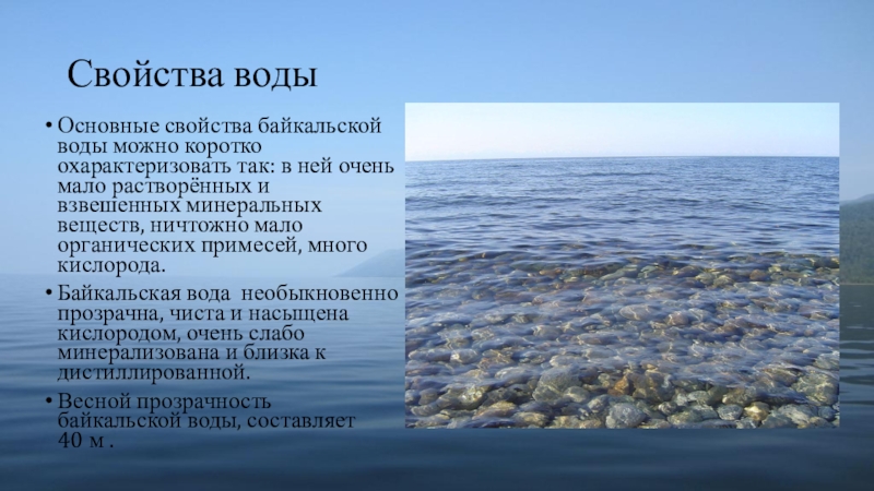 Байкальская вода необыкновенно прозрачна, чиста и насыщена кислородом, очень слабо минерализована и близка к дистиллированной.