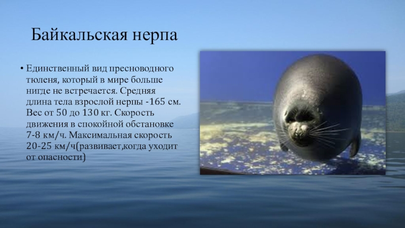встречается. Средняя длина тела взрослой нерпы -165 см.Вес от 50 до 130 кг. Скорость движения в спокойной обстановке 7-8 км/ч. Максимальная скорость 20-25 км/ч(развивает,когда уходит от опасности)