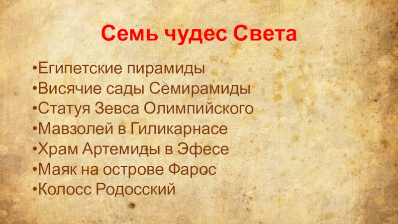 Семь чудес СветаЕгипетские пирамидыВисячие сады СемирамидыСтатуя Зевса ОлимпийскогоМавзолей в ГиликарнасеХрам Артемиды в ЭфесеМаяк на острове ФаросКолосс Родосский