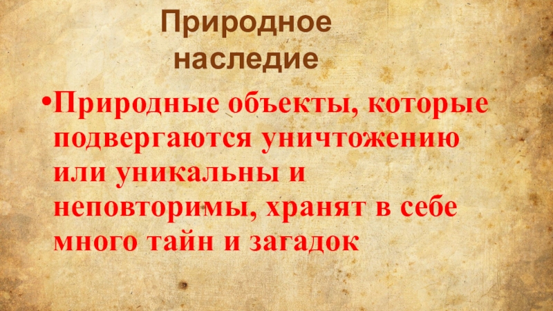 Природное наследие Природные объекты, которые подвергаются уничтожению или уникальны и неповторимы, хранят в себе много тайн и загадок