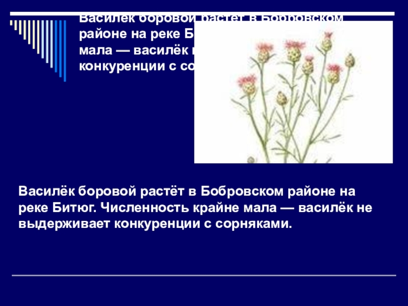 Василёк боровой растёт в Бобровском районе на реке Битюг. Численность крайне мала — василёк не выдерживает конкуренции с сорняками.