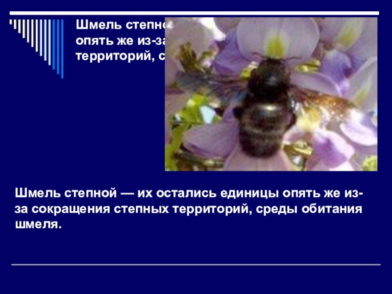 Шмель степной — их остались единицы опять же из-за сокращения степных территорий, среды обитания шмеля.
