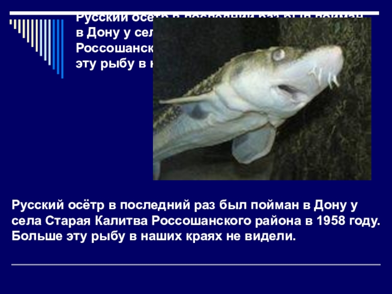Русский осётр в последний раз был пойман в Дону у села Старая Калитва Россошанского района в 1958 году. Больше эту рыбу в наших краях не видели.