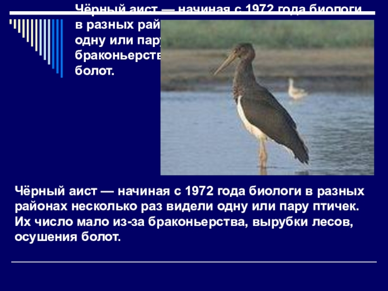 Чёрный аист — начиная с 1972 года биологи в разных районах несколько раз видели одну или пару птичек. Их число мало из-за браконьерства, вырубки лесов, осушения болот.