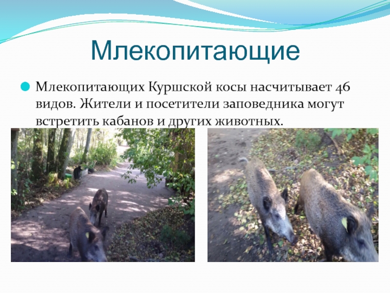МлекопитающиеМлекопитающих Куршской косы насчитывает 46 видов. Жители и посетители заповедника могут встретить кабанов и других животных.