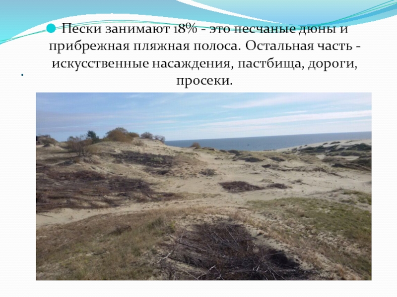 Пески занимают 18% - это песчаные дюны и прибрежная пляжная полоса.