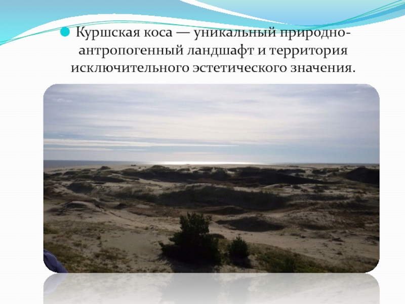Слайд 3Куршская коса — уникальный природно-антропогенный ландшафт и территория исключительного эстетического значения.
