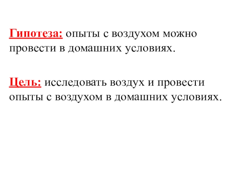 Гипотеза: опыты с воздухом можно провести в домашних условиях.Цель: исследовать воздух и провести опыты с воздухом в домашних условиях.