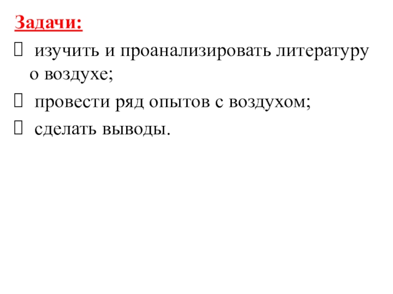 Задачи: изучить и проанализировать литературу о воздухе; провести ряд опытов с воздухом; сделать выводы.