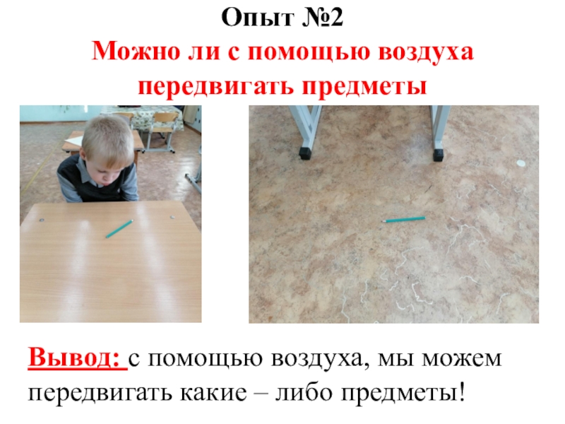 Опыт №2 Можно ли с помощью воздуха передвигать предметыВывод: с помощью воздуха, мы можем передвигать какие –