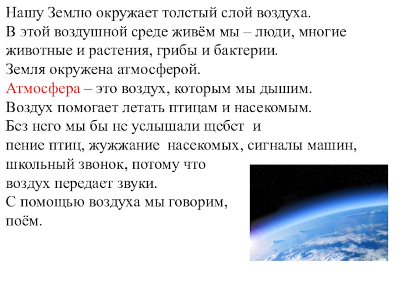 Нашу Землю окружает толстый слой воздуха.В этой воздушной среде живём мы – люди, многие животные и растения,