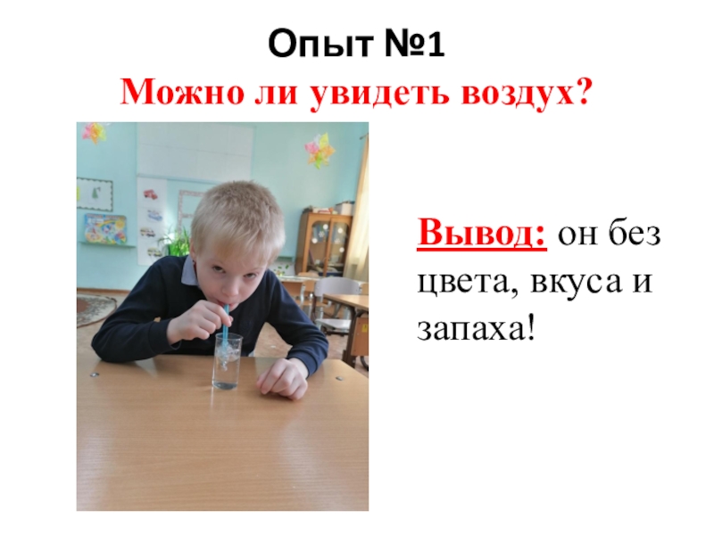 Опыт №1 Можно ли увидеть воздух?Вывод: он без цвета, вкуса и запаха!