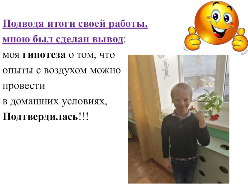 Подводя итоги своей работы, мною был сделан вывод: моя гипотеза о том, что опыты с воздухом можно